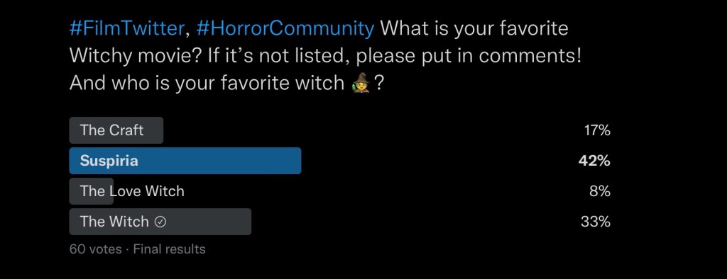 I did a poll regarding people’s favorite witches on Twitter, and Suspiria won (though I’m not sure if it’s the OG or remakes) but there was also some additional, wonderful write-in love for Practical Magic, Teen Witch and You Won’t Be Alone (a movie I loved from last year).
